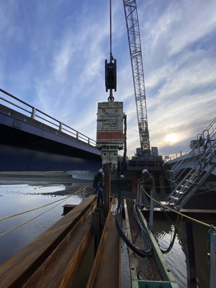 仮橋架け替え工事の現場から画像が届きました。 夕日をバックに黄昏れているように見えますが、 仕事はしっかりやらせていただいておりますのでご安心を。